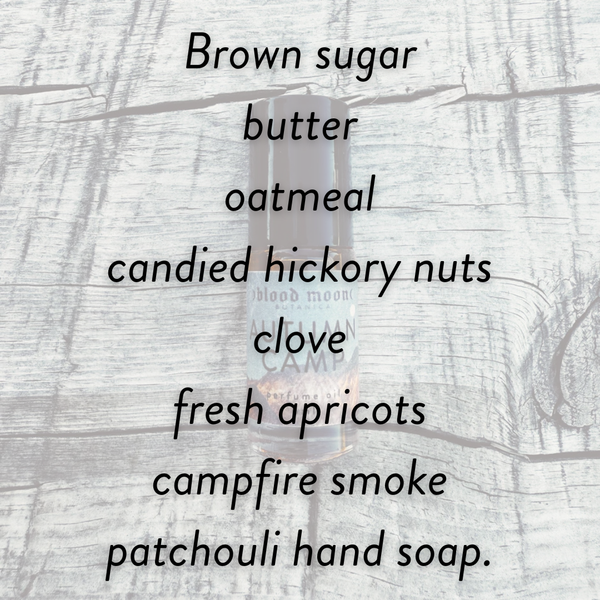 Memories of morning camp in the canyonlands. Brown sugar, butter and oatmeal with candied hickory nuts, clove, fresh apricots, campfire smoke, and a waft of patchouli hand soap.