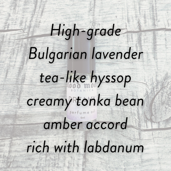 Persistent lavender notes throughout this dreamy perfume blend. Calms the nerves. Tonka bean adds creaminess, while amber adds groundedness to this blend and soft hyssop adds unique herbal tea like notes.