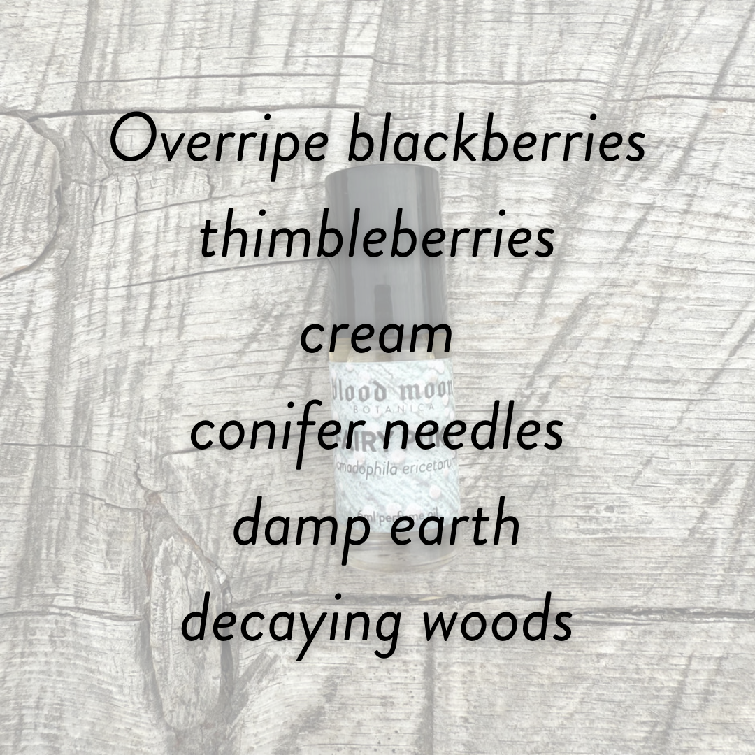 Overripe blackberries and thimbleberries, cream, conifer needles, damp earth, and decaying woods.