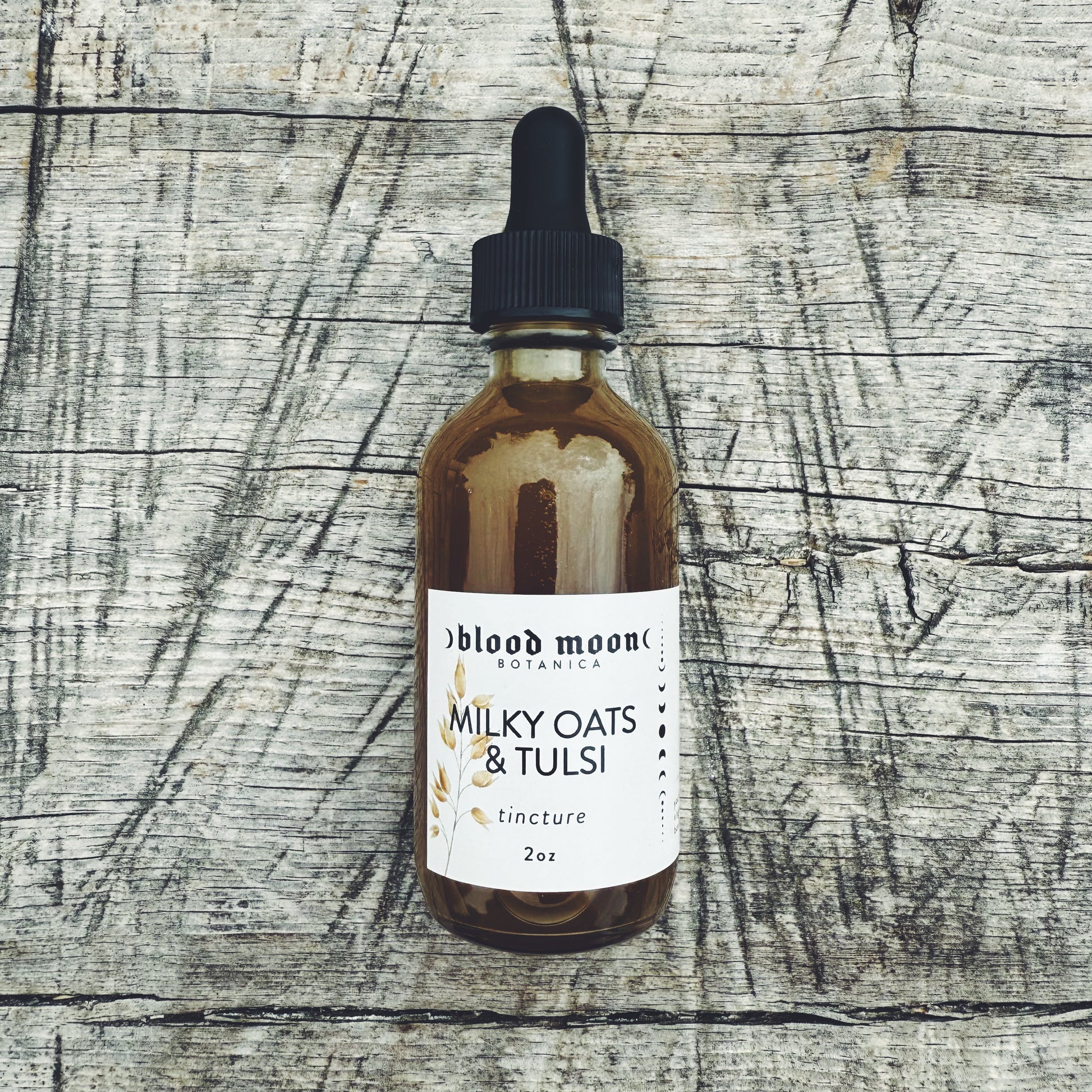 Organic fresh milky oats and fresh tulsi (holy basil) extracted into a base of vodka.